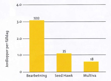 Muokkaamattomassa pellossa pellon pinta pysyi hieman viileämpänä, joka vähensi kirppojen esiintymistä selvästi (ensimmäinen taulukko). Valitettavasti myös rapsin kasvuunlähtö oli hidasta ja vajaata. Taimitiheys jäi harvaksi ja sato oli heikompi (toinen taulukko; taimitiheys punainen ja sato sininen). Muokkaamattoman pellon suorakylvö kannattaakin tehdä vasta hieman myöhemmin, kuten suomalaiset viljelijät ovatkin todenneet.